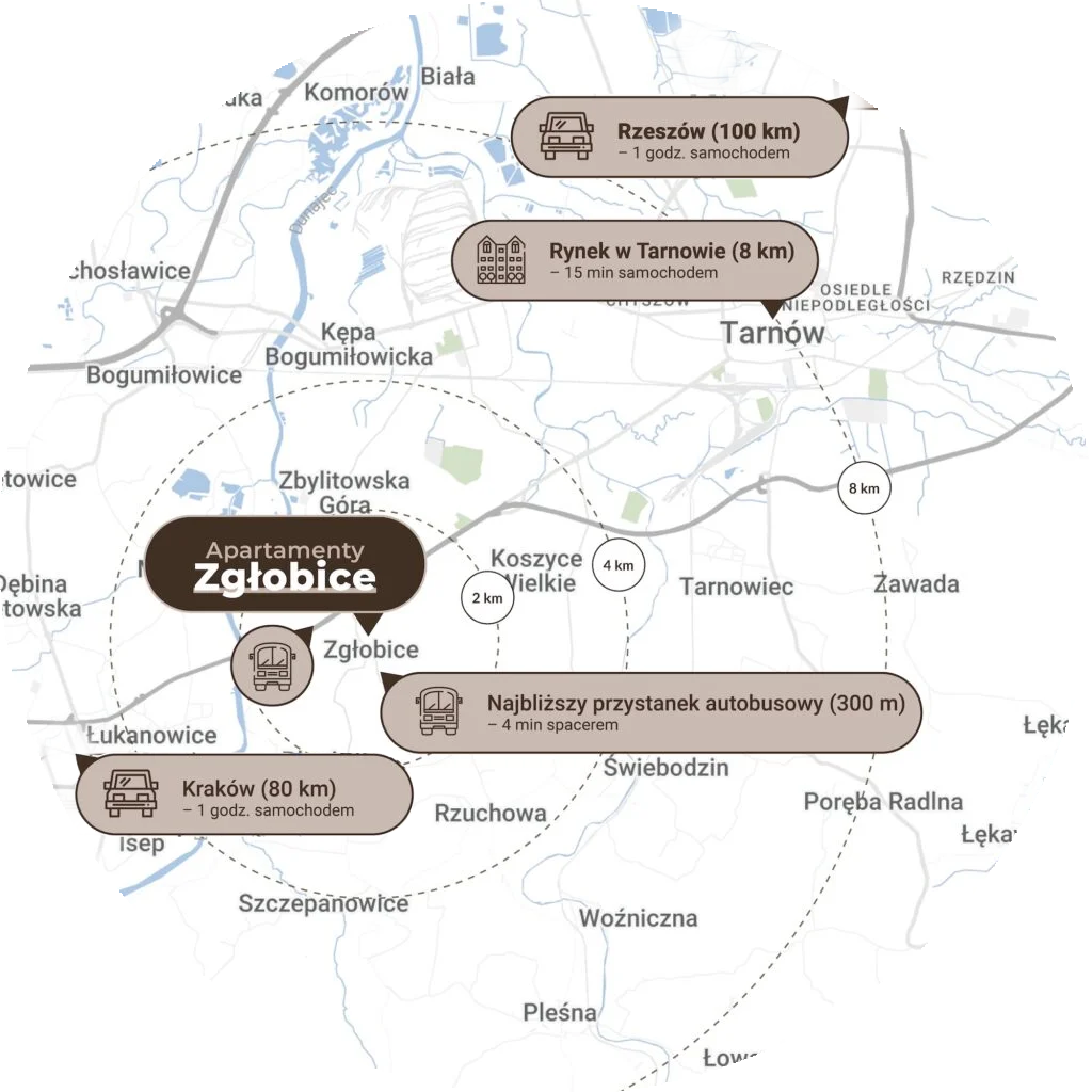 Inwestycja znajduje się przy ul. Zgłobickiej w Zgłobicach – zaledwie kilka minut od Tarnowa i najważniejszych tras w regionie. Do autostrady A4 dotrzesz w 10 minut, a do drogi krajowej 94 w niecałe 3 min – to idealna lokalizacja, jeśli cenisz szybki i wygodny dojazd do pracy, szkoły czy na weekendowy wypoczynek. Bez problemu skorzystasz też z komunikacji miejskiej – przystanek znajduje się w zasięgu krótkiego spaceru. W tej okolicy żyjesz spokojnie, ale nie rezygnujesz z wygody, którą daje bliskość miasta.