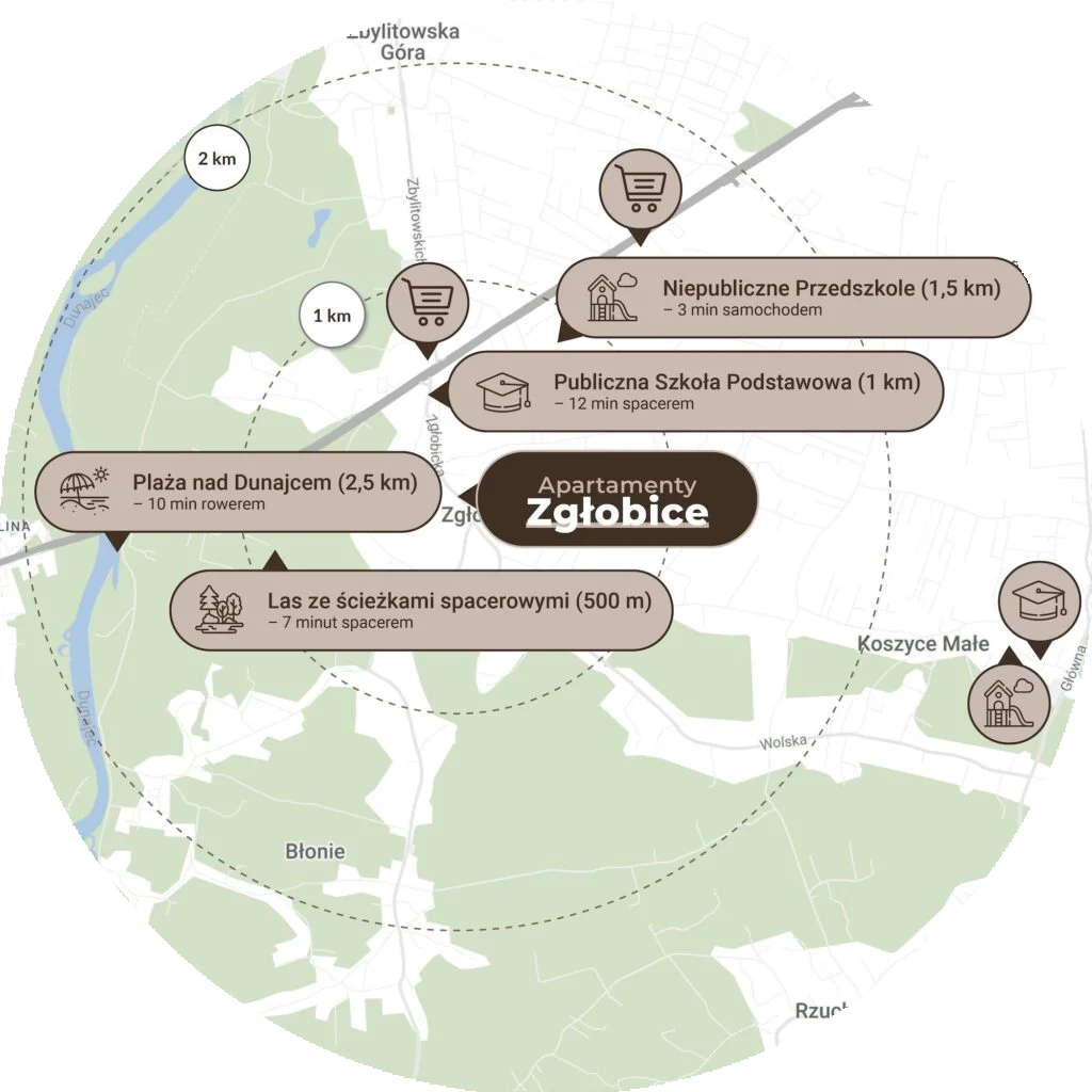 W bezpośrednim sąsiedztwie Apartamentów Zgłobice masz wszystko, czego potrzebujesz na co dzień – i jeszcze więcej. Szkoła, przedszkole, przychodnia czy sklepy są dosłownie kilka minut od domu, a do Galerii Tarnovia dotrzesz samochodem w mniej niż 10 minut. Otoczenie pełne zieleni, spokojnych uliczek i bliskość natury zachęca do spacerów, jazdy na rowerze oraz wspólnego spędzania czasu z rodziną. To miejsce, w którym naprawdę możesz złapać oddech.